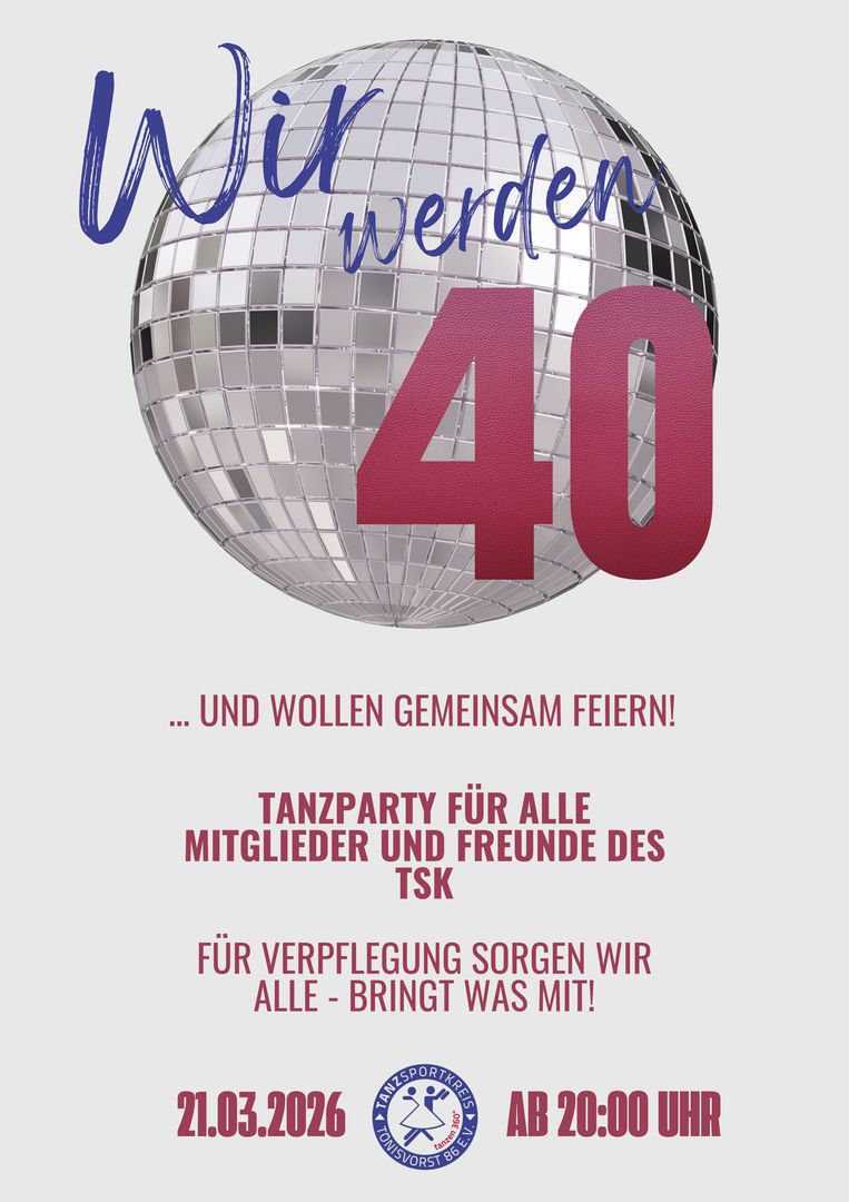 Tanzparty für alle Mitglieder und Freunde des TSK. Für Verpflegung (Essen) sorgen wir alle - Mitbringparty! Bitte tragt Euch in die Mitbringliste im Clubheim ein.
